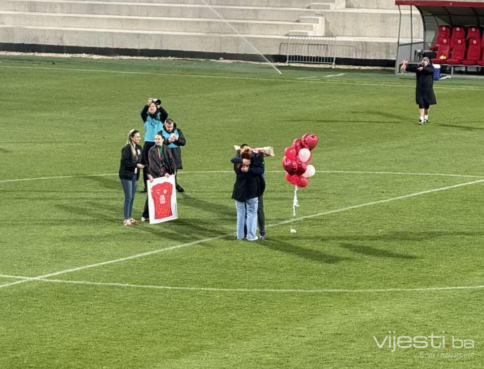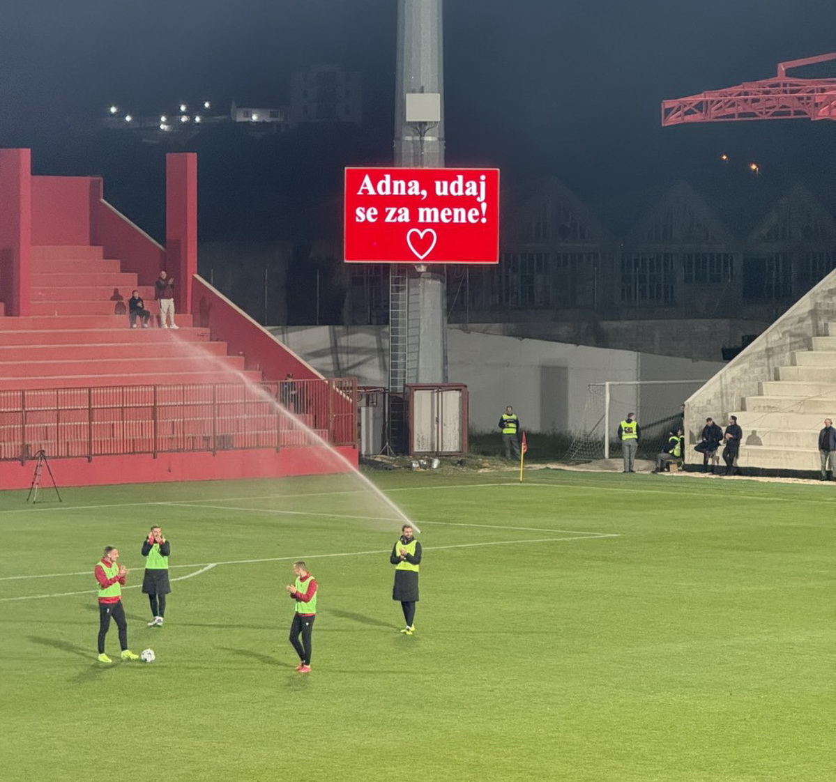 Klub je tokom pauze priredio lažnu nagradnu igru, a nagradu je upravo dobila njegova djevojka Adna. Kada je izašla na teren kako bi preuzela nagradu, dobila je sliku na poklon i pozirala pred kamerama. Ali, pravi trenutak uslijedio je kada se iza nje pojavio njezin dečko s buketom cvijeća i prstenom u ruci.