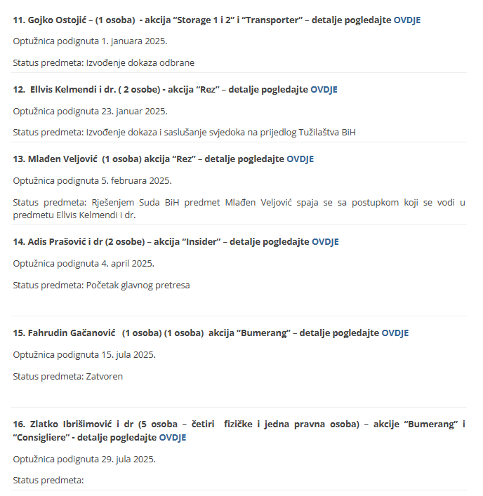 Aplikacija sa podacima o optužnicama “SKY I ANOM PREDMETI 2021-2025 “ na web stranici Tužilaštva BiH ažurirana je novim podacima.
