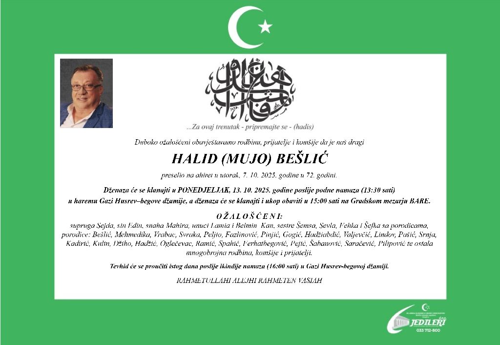 Legendarni pjevač Halid Bešlić preminuo je jučer u Sarajevu, a danas je objavljena smrtovnica koja potvrđuje oproštaj od čovjeka koji je svojim talentom i toplinom spajao ljude.