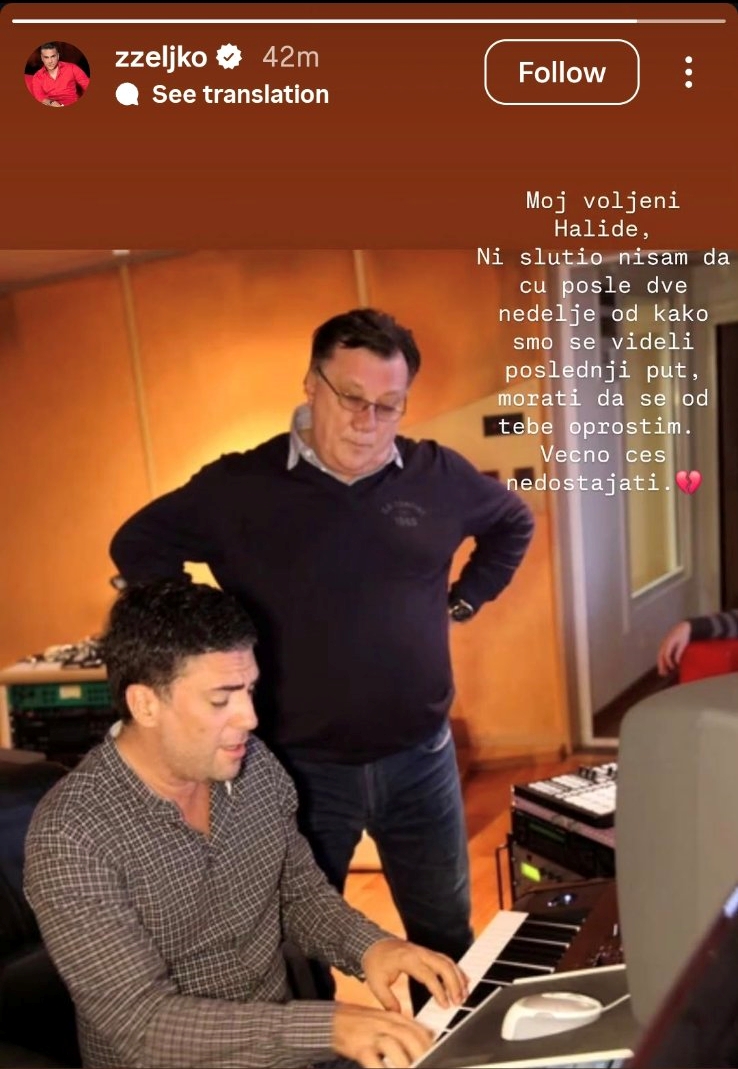 - Moj voljeni Halide, ni slutio nisam da ću poslije dvije sedmice od kako smo se vidjeli posljednji put, morati da se od tebe oprostim. Vječno ćeš nedostajati - napisao je Željko Joksimović u objavi i dodao emodži slomljenog srca.