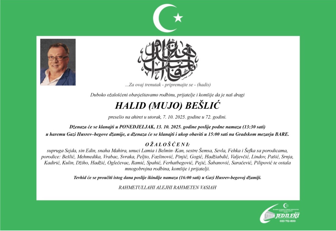 Dženaza-namaz Halidu Bešliću klanjat će se danas, poslije podne namaza (u 13:30 sati) u haremu Gazi Husrev-begove džamije u Sarajevu, a ukop će se obaviti u 15.00 sati na Gradskom mezarju Bare.