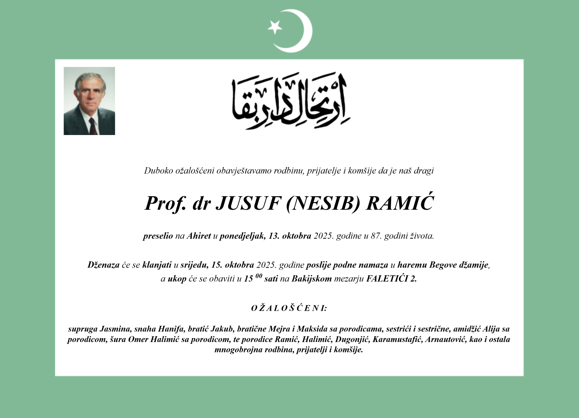 Prof. dr. Jusuf Ramić, redovni profesor u penziji na Fakultetu islamskih nauka u Sarajevu, preselio je na ahiret jutros u Sarajevu nakon duže bolesti, javila je MINA.