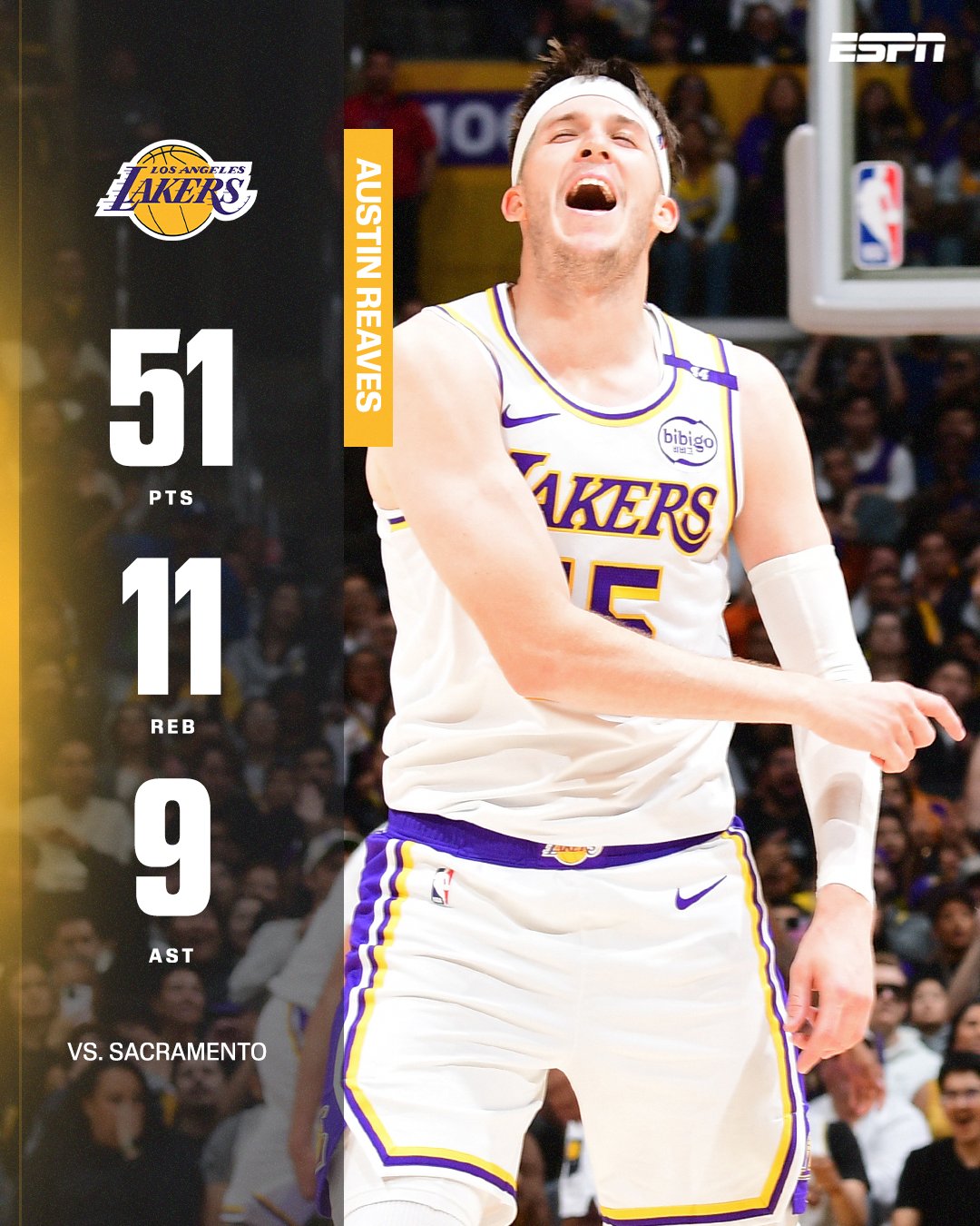 U odsustvu povrijeđenih zvijezda Lakersa, Luke Dončića i LeBrona Jamesa, Reaves je briljirao postigavši čak 51 poen – što je njegov lični rekord – uz 11 skokova i devet asistencija.