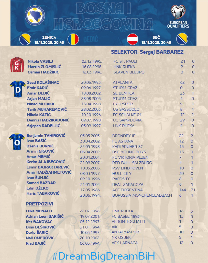 Selektor Sergej Barbarez u ovim susretima računa na 24 igrača, a spisak možete preuzeti OVDJE.