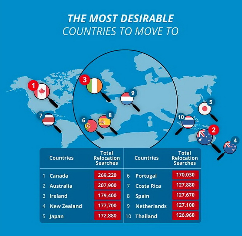Analizom globalnih podataka Google pretraživanja utvrđeno je da je Kanada drugu godinu zaredom zauzela prvo mjesto, s ukupno 269.220 pretraživanja vezanih uz preseljenje samo ove godine.