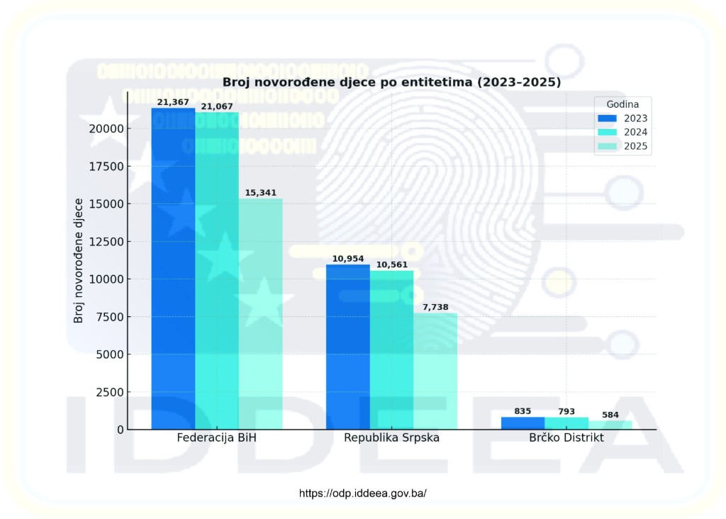 Zaključno s 27. oktobrom 2025. godine, evidentirano je 23.663 novorođenih, što je za gotovo 9.500 djece manje u odnosu na 2023. godinu.