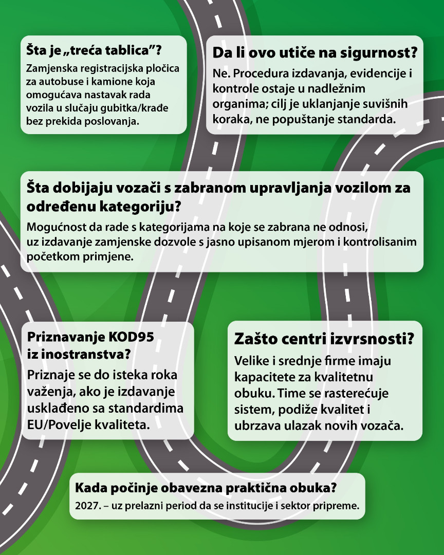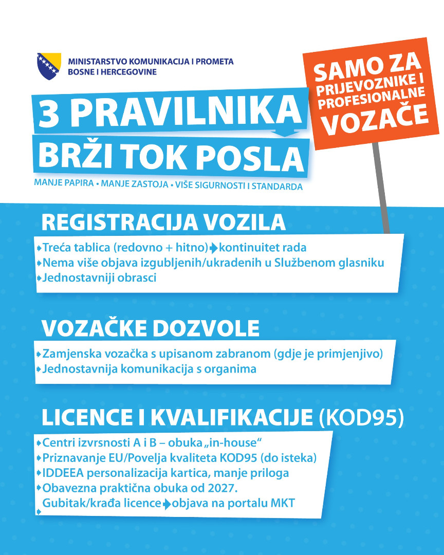 “Pravilnik o uslovima izdavanja licenci i kvalifikacijskih kartica vozača je izmijenjen na način da srednji i veliki prevoznici sami obučavaju svoje vozače. Nekad je taj posao radila samo jedna firma, pa smo taj monopol ranije ukinuli. Veliki prevoznici mogu raditi gotovo cijelu obuku, a srednje firme dio, odnosno nekih 50 posto. Time reformišemo ovu oblast i ispunjavamo jedan od najvećih zahtijeva prevoznika. Izdavanje kartica ići će brže, radićemo preko IDDEEA-e”, rekao je Forto.