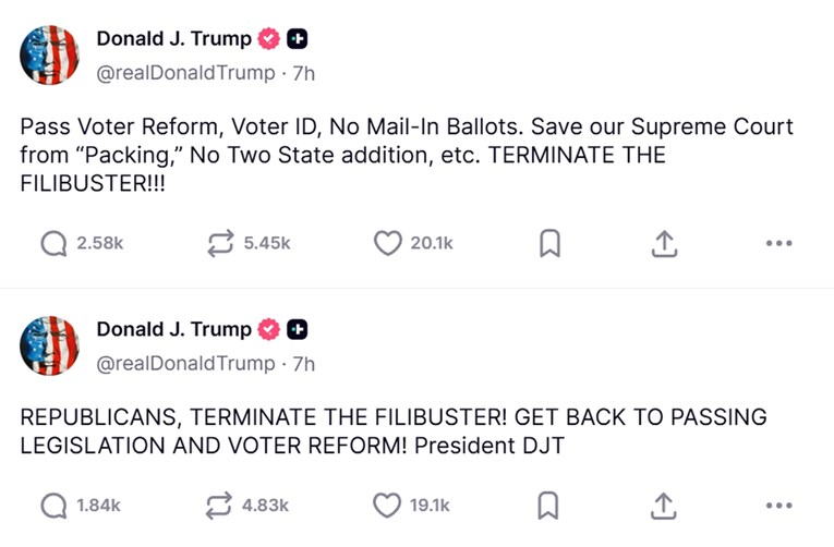 "Usvojite reformu glasanja, lične iskaznice za glasače, bez glasanja poštom. Spasite naš Vrhovni sud od „pakiranja“, bez dodavanja dviju država itd. UKINITE FILIBUSTER!!!" napisao je Trump u objavi na društvenoj mreži Truth Social.