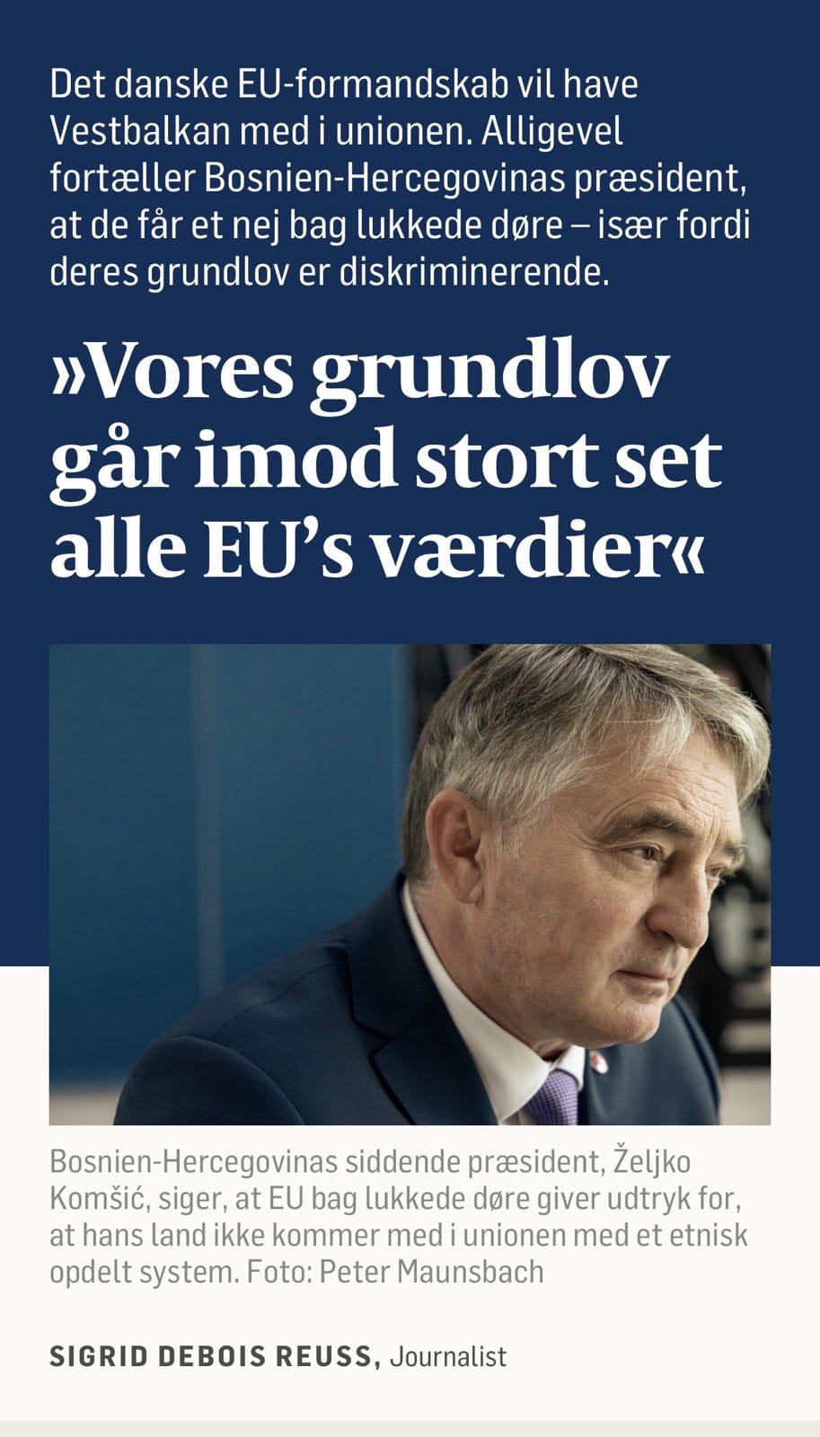 Predsjedavajući Predsjedništva Bosne i Hercegovine, Željko Komšić, dao je opširan intervju za danski list Politiken u kojem je između ostalog rekao da EU iza zatvorenih vrata poručuje kako BiH ne može postati članica Unije sa sadašnjim, etnički podijeljenim sistemom.