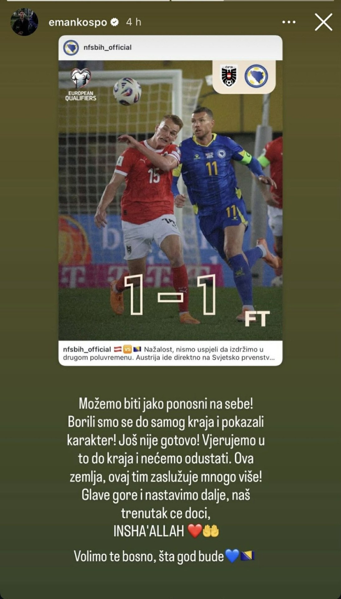 "Možemo biti jako ponosni na sebe! Borili smo se do samog kraja i pokazali karakter. Još nije gotovo. Vjerujemo u to do kraja i nećemo odustati. Ova zemlja, ovaj tim zaslužuju mnogo više! Glave gore i nastavimo dalje, naš trenutak će doći. Insha'Allah". Volimo te Bosno, šta god bude", poručio je Košpo uz emotikon bh. zastave, molitve i srca.