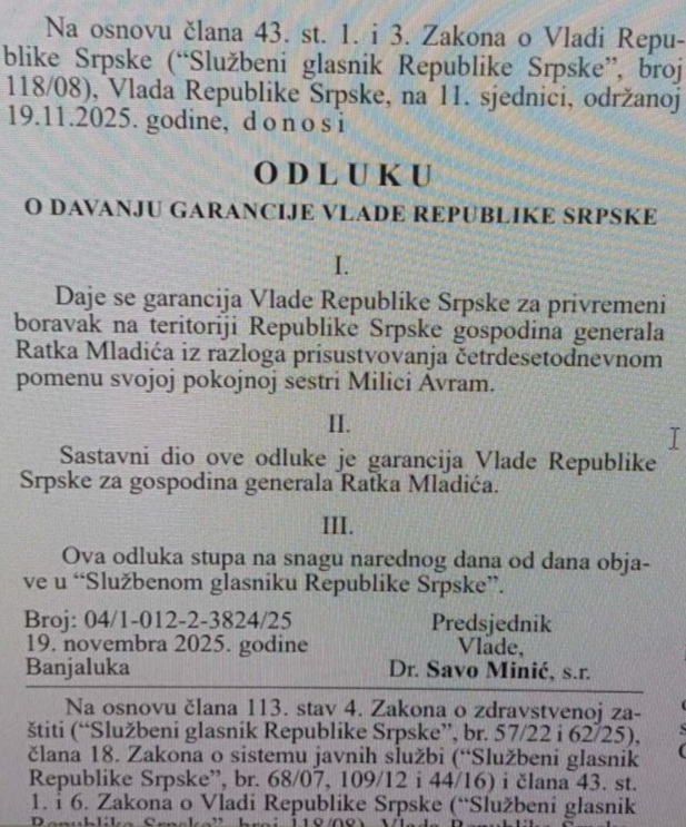 Kako je objavljeno u Službenom glasniku RS-a, Vlada ovog entiteta daje garanciju za privremeni boravak Mladića zbog, kako su naveli, četrdesetodnevnom pomenu njegove preminule sestre Milice Avram.