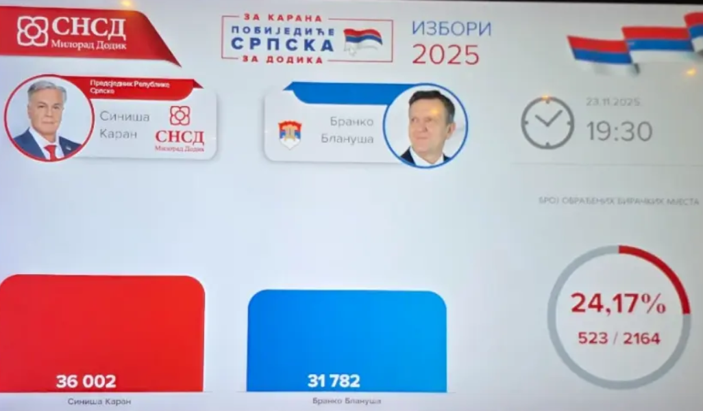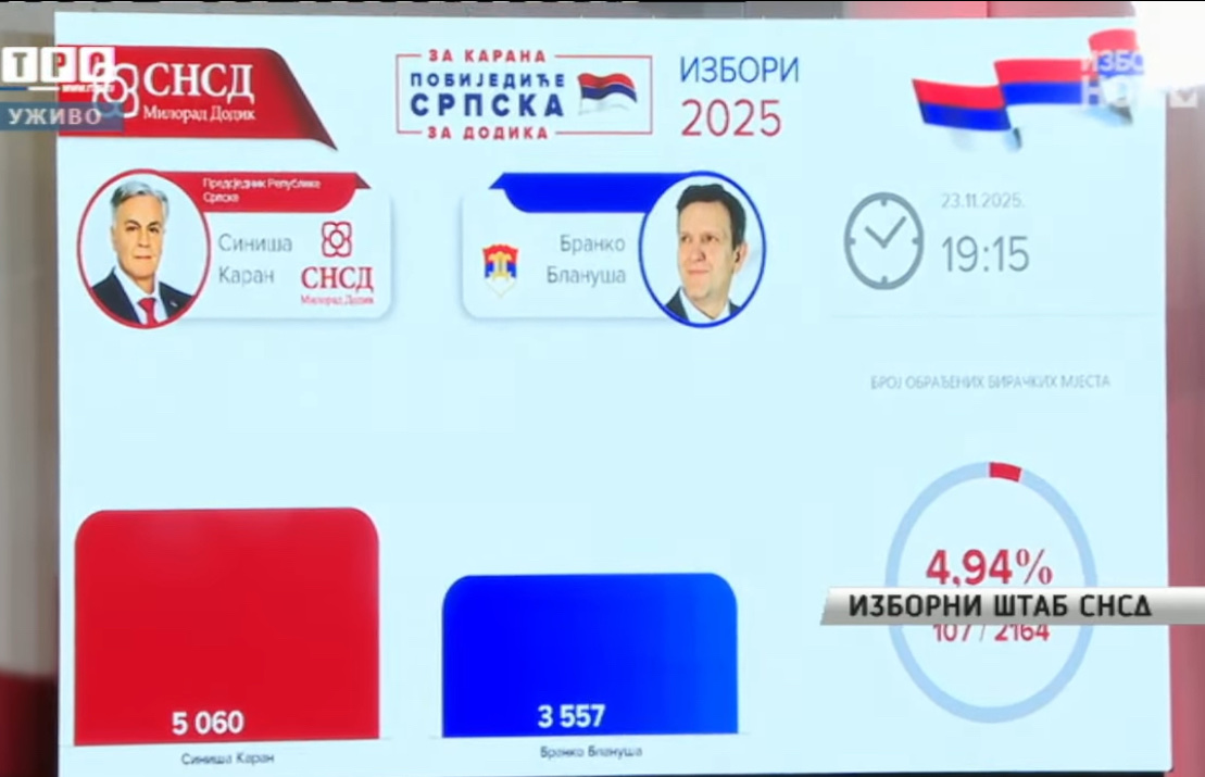 19.18 - SNSD je objavio prve rezultate. Na 5 posto prebrojanih vodi Siniša Karan.