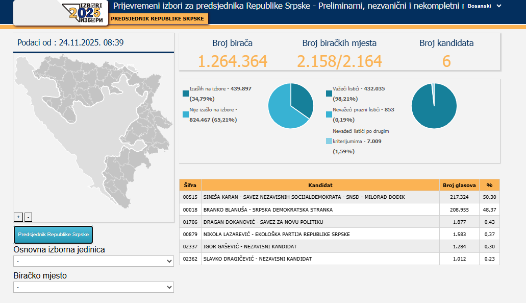 Podsjećamo, Centralna izborna komisija Bosne i Hercegovine objavila je ažurirane, preliminarne rezultate vanrednih izbora za predsjednika entiteta RS, prema kojima je SNSD-ov Siniša Karan i dalje u vodstvu ispred kandidata SDS-a Branka Blanuše.