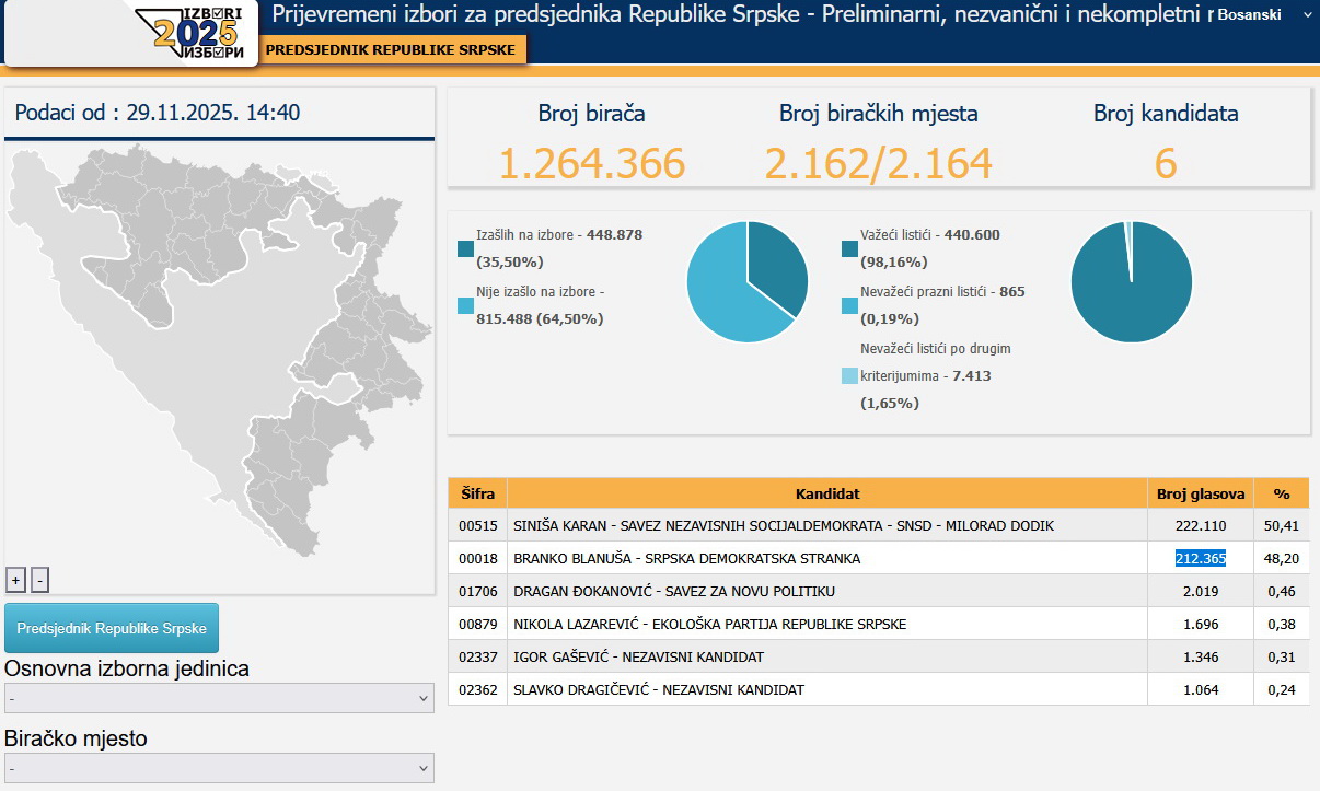 Nakon obrađenih 99,91 posto biračkih mjesta, kandidat SNSD-a Siniša Karan je osvojio povjerenje 222.110 birača za predsjednika RS-a, dok je za Branka Blanušu glasalo 212.365 građana.