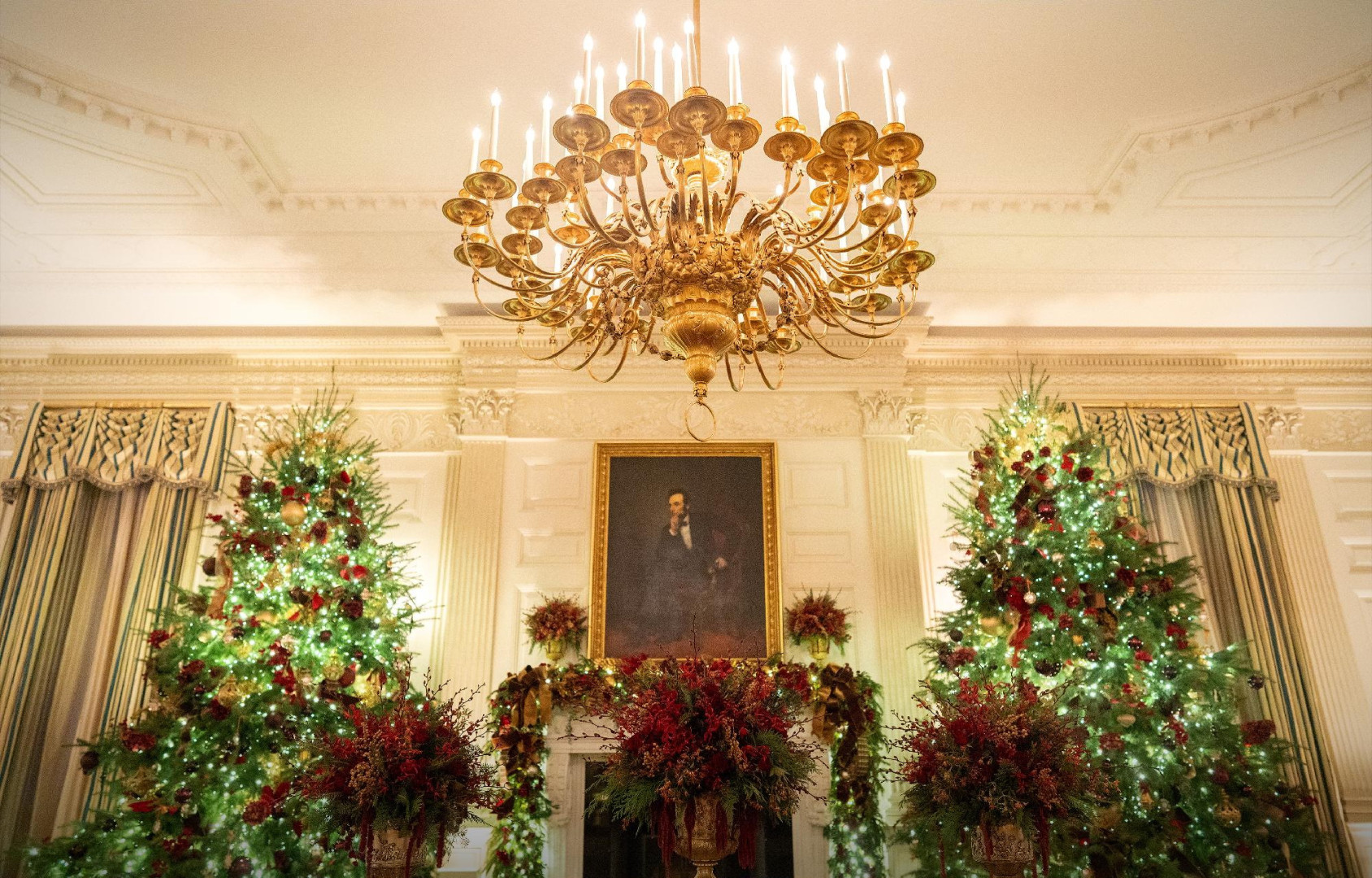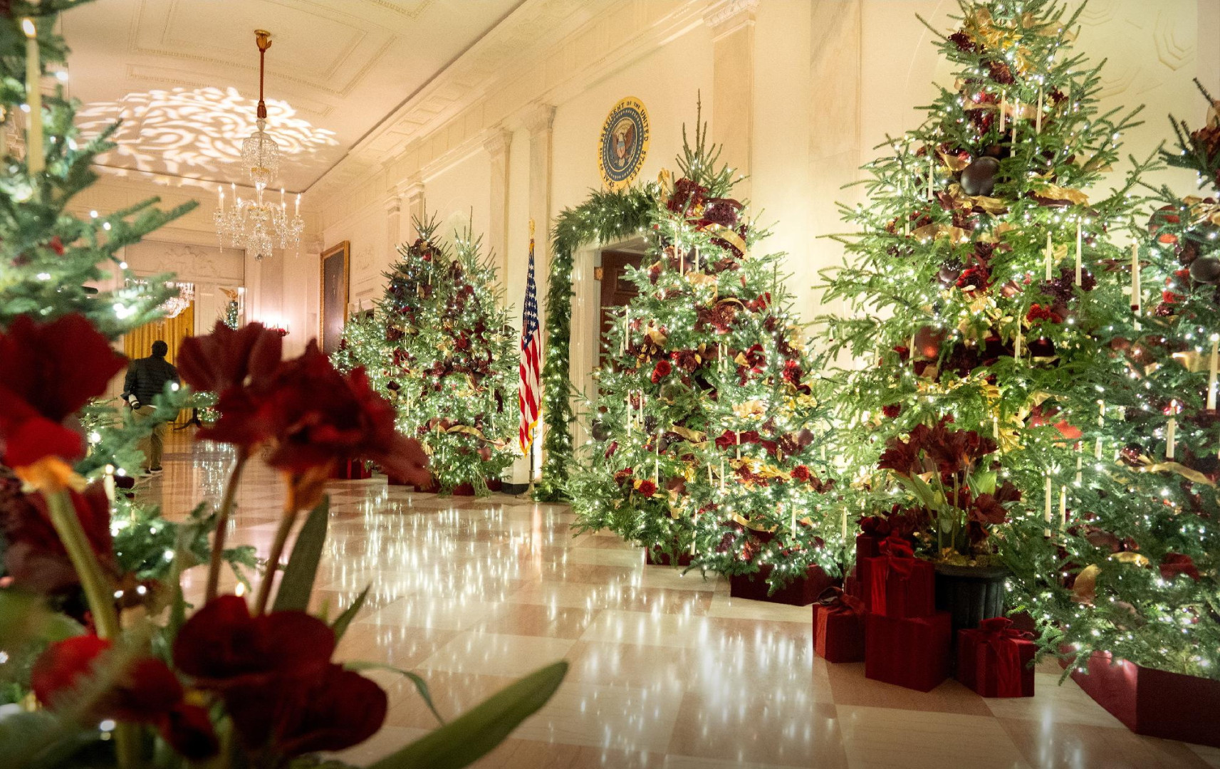 U skladu s tradicijom, svaka od soba ima svoju podtemu. East Room posvećena je 250. godišnjici potpisivanja Deklaracije o nezavisnosti. Patriotski ukrasi u crvenoj, bijeloj i plavoj boji, s orlovima i 250 zvijezda, nose podtemu "Dom je tamo gdje je srce: Amerika, naš dom", prenosi Index.hr.