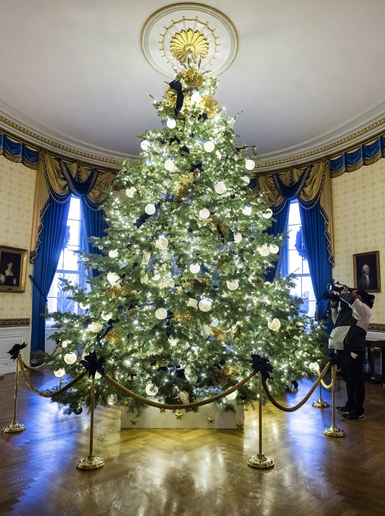 Bijela kuća sjaji uz pomoć više od 10.000 plavih leptira, 7.000 metara vrpce, 2.000 svjetlosnih niti, 2.800 zlatnih zvijezda, 200 metara vijenaca, 55 kila medenjaka, 51 božićnog drvca i 75 klasičnih vijenaca. Posjetioci će ove godine moći posjetiti Bijelu kuću uz izmijenjenu rutu.