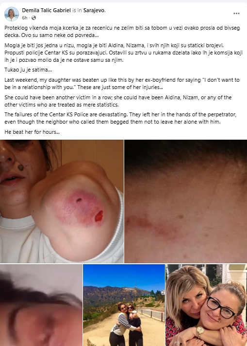 "Proteklog vikenda moja kćerka je za rečenicu- ne želim biti sa tobom u vezi ovako prošla od bivšeg dečka. Ovo su samo neke od povreda… Mogla je biti još jedna u nizu, mogla je biti Aldina, Nizama, i svih njih koji su statistički brojevi.