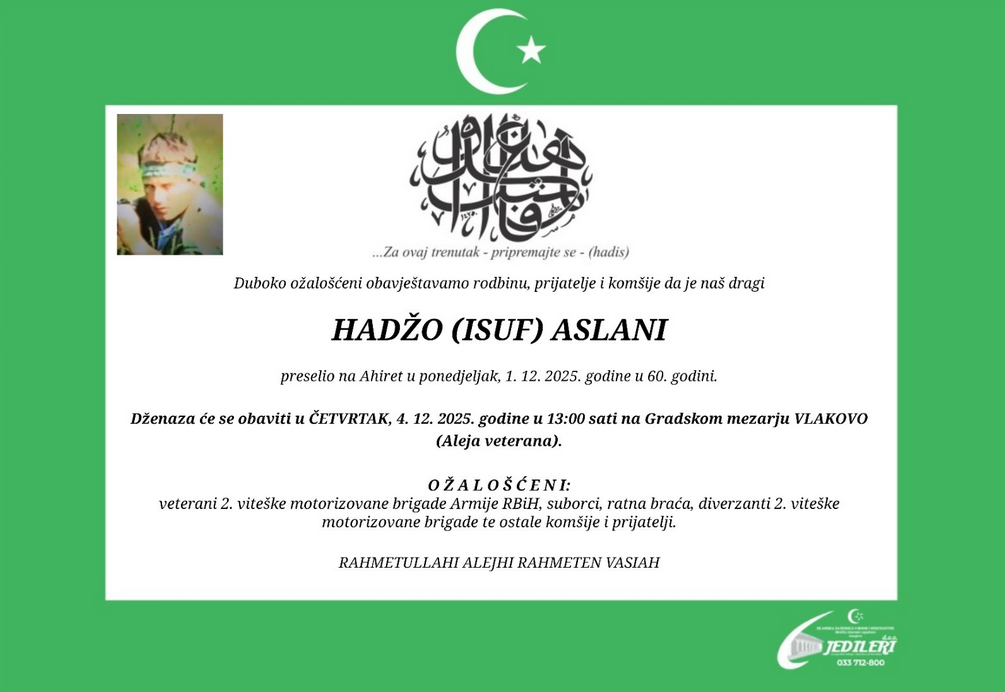 Hadžo Aslani ostat će upamćen ne samo kao ratni heroj i diverzant, već i kao osoba koju su pratili saborci i prijatelji i koja je do posljednjih trenutaka života bila podržavana od zajednice. Njegova dženaza bit će obavljena u četvrtak, 4. decembra 2025. godine u 13:00 na Gradskom mezarju Vlakovo, u Aleji veterana.