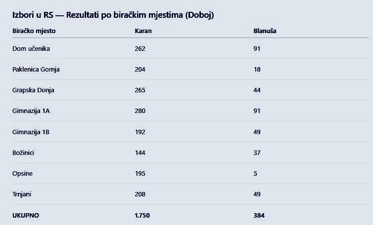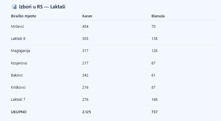 U Laktašima će se ponovo brojati sedam biračkih mjesta. Na tih sedam, Karan je osvoji ukupno 2.125, a Blanuša 737 glasova.
