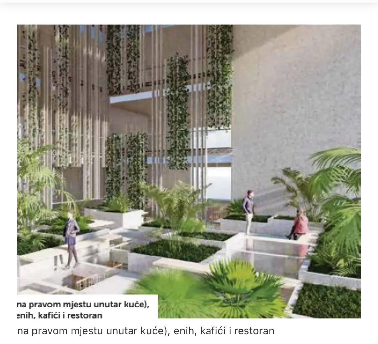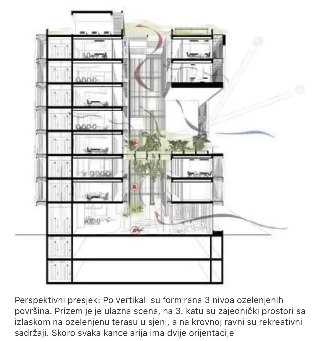 Ova naša kuća bi se tek na krovu ostvarila, jer naš prijedlog je bio da krov bude supstitut za park u kojem se gradi. To bi bio krovni park za rekreaciju uposlenih i recharge njihove energije.