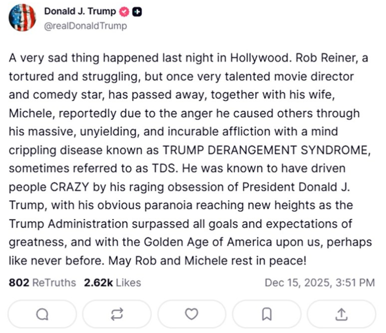 U poruci objavljenoj na društvenim mrežama Trump je naveo da se u Hollywoodu dogodila, kako je rekao, „vrlo tužna stvar“, te da su Rob Reiner i njegova supruga Michele preminuli zajedno. Reiner je pritom opisan kao „mučeni i izgubljeni“, ali i kao nekada vrlo talentiran filmski reditelj i komičarska zvijezda.