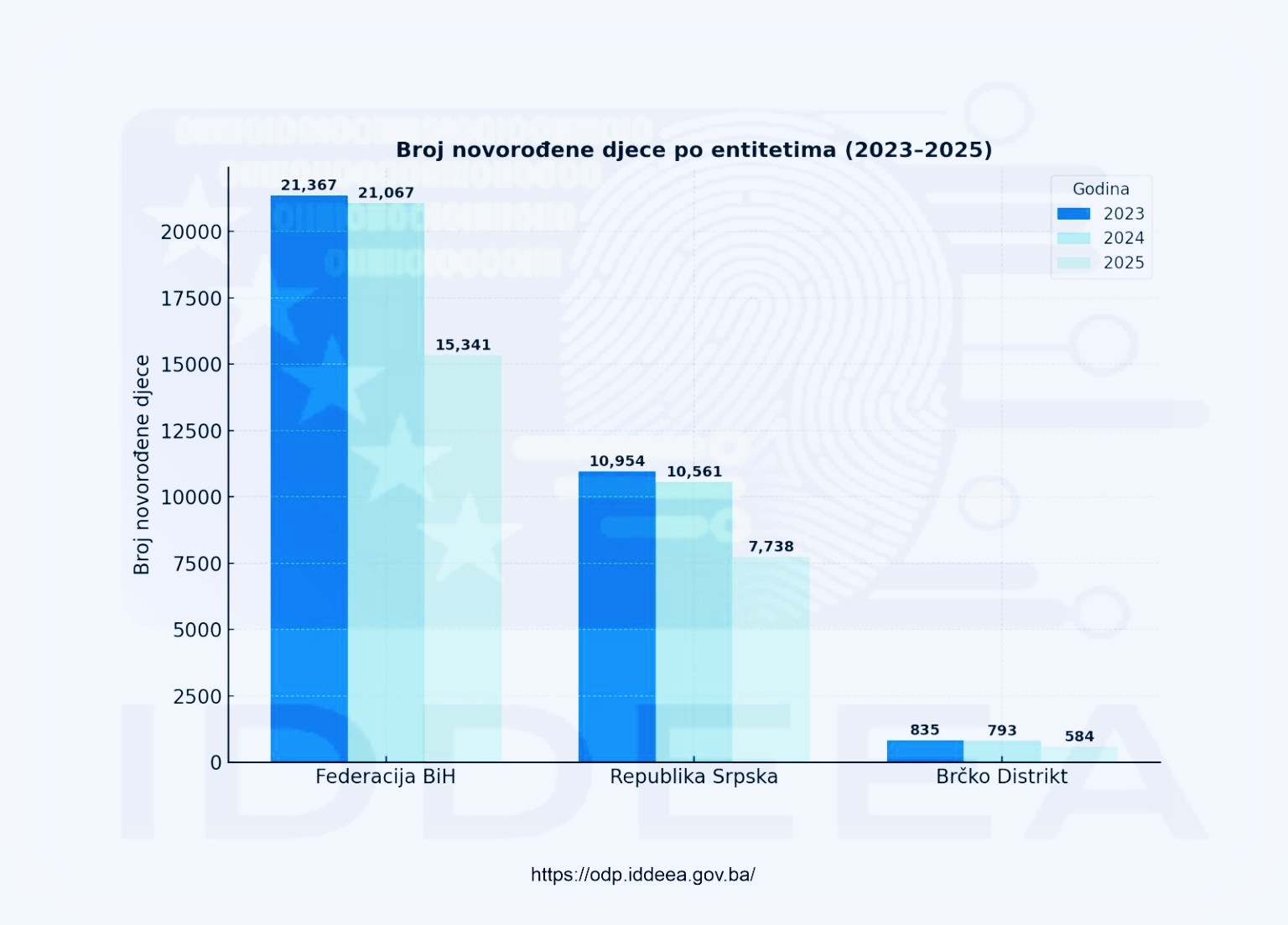 Inače, u periodu od 2023. do 2025. godine zabilježen je kontinuiran pad nataliteta u cijeloj Bosni i Hercegovini, govore podaci iz evidencija koje održava Agencija za identifikacione dokumente, evidenciju i razmjenu podataka Bosne i Hercegovine (IDDEEA BiH).