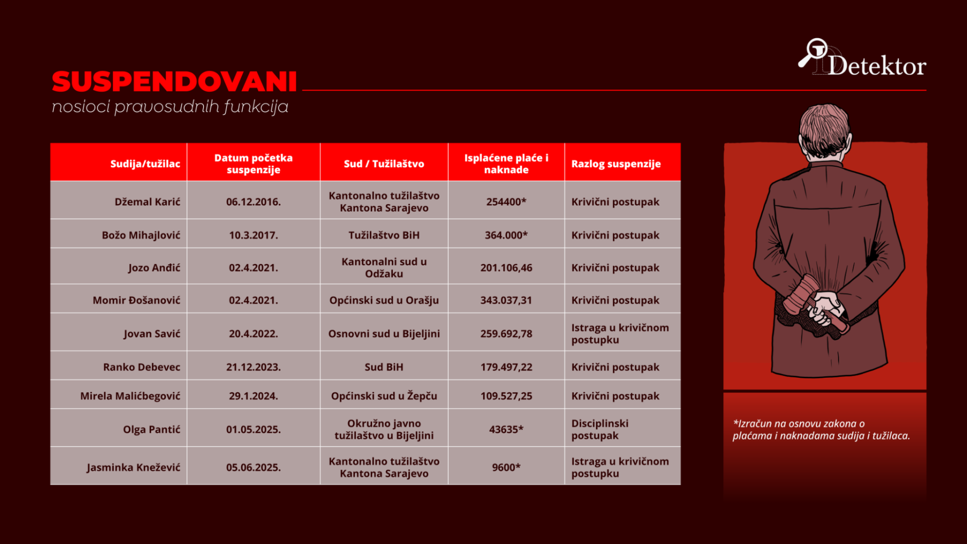 Funkciju tužioca Karić ne obavlja od kraja 2016. godine, kada je suspendovan. Od tada do novembra 2025. njemu je iz budžeta isplaćeno najmanje 250.000 maraka na osnovu plaća.