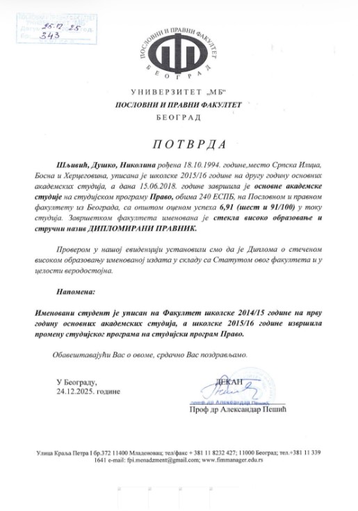 Zbog potencijalnog izvrtanja i ove informacije, napominje da je Univerzitet u periodu od njenog diplomiranja do danas promijenio naziv i da danas posluje kao Univerzitet MB, koji je pravni sljednik Univerziteta "Union - Nikola Tesla", uz puni kontinuitet prava, obaveza i važenja diploma, zbog čega je navedeni Univerzitet i izdavač priložene potvrde.
