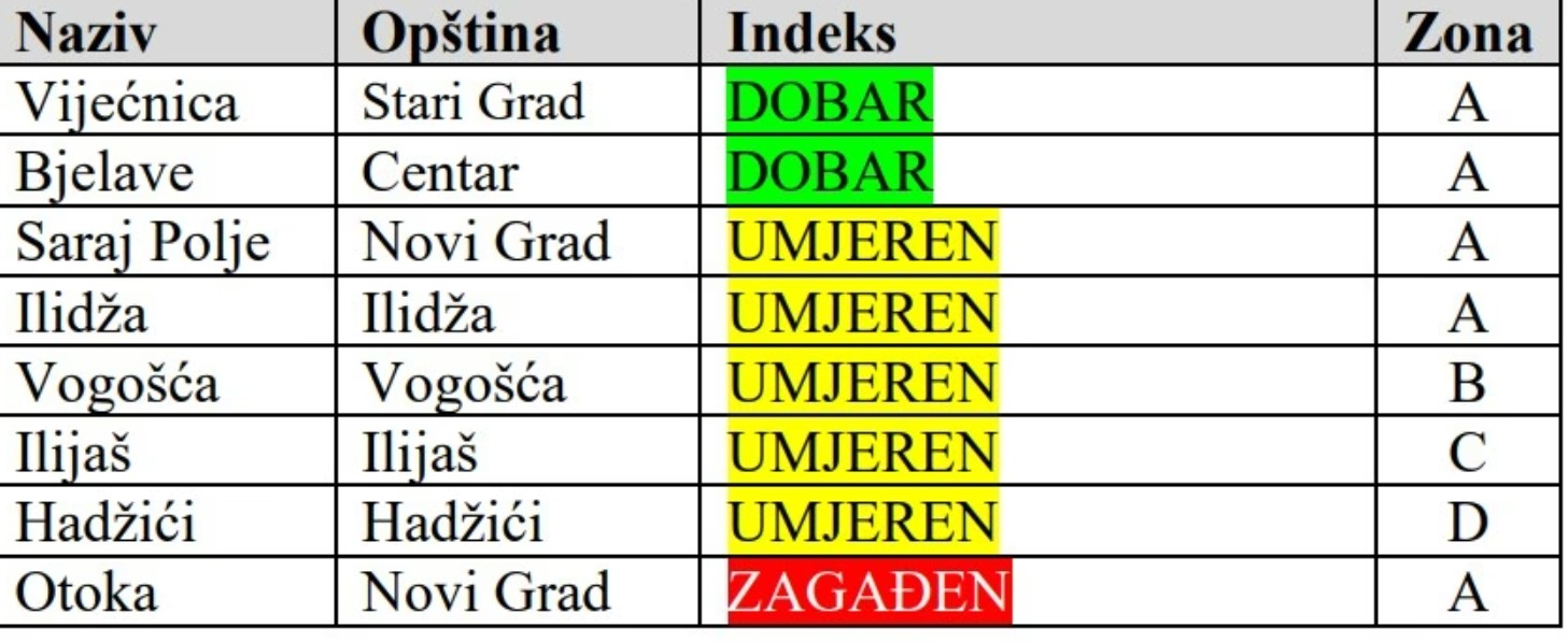 Na mjernim stanicama Vijećnica i Bjelave zabilježen je dobar kvalitet zraka. Umjeren kvalitet evidentiran je na područjima Saraj Polja, Ilidže, Vogošće, Ilijaša i Hadžića, dok je na lokalitetu Otoka zrak i dalje ocijenjen kao zagađen.