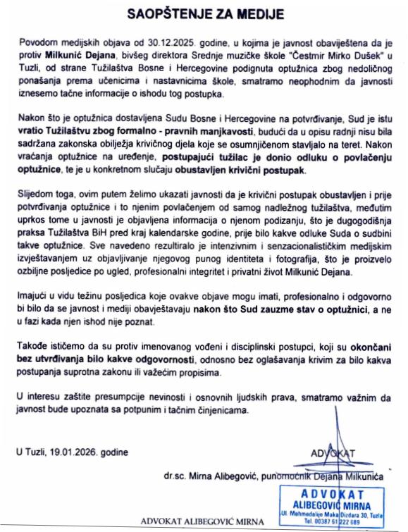 "Sve navedeno rezultiralo je intenzivnim i senzacionalističkim medijskim izvještavanjem uz objavljivanje njegovog punog identiteta i fotografija, što je proizvelo ozbiljne posljedice po ugled, profesionalni integritet i privatni život Dejana Milkunića. Imajući u vidu težinu posljedica koje ovakve objave mogu imati, profesionalno i odgovorno bi bilo da se javnost i mediji obavještavaju nakon što Sud zauzme stav o optužnici, a ne u fazi kada nien ishod nije poznat", navodi se u saopćenju opunomoćenice Dejana Milkunića.