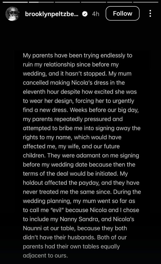 Peltz Beckham, najstarije dijete Davida Beckhama i Victorie Beckham, optužio je svoje roditelje da „neprestano pokušavaju uništiti“ njegovu vezu s Nicolom Peltz Beckham, i prije i poslije njihovog vjenčanja 2022. godine.