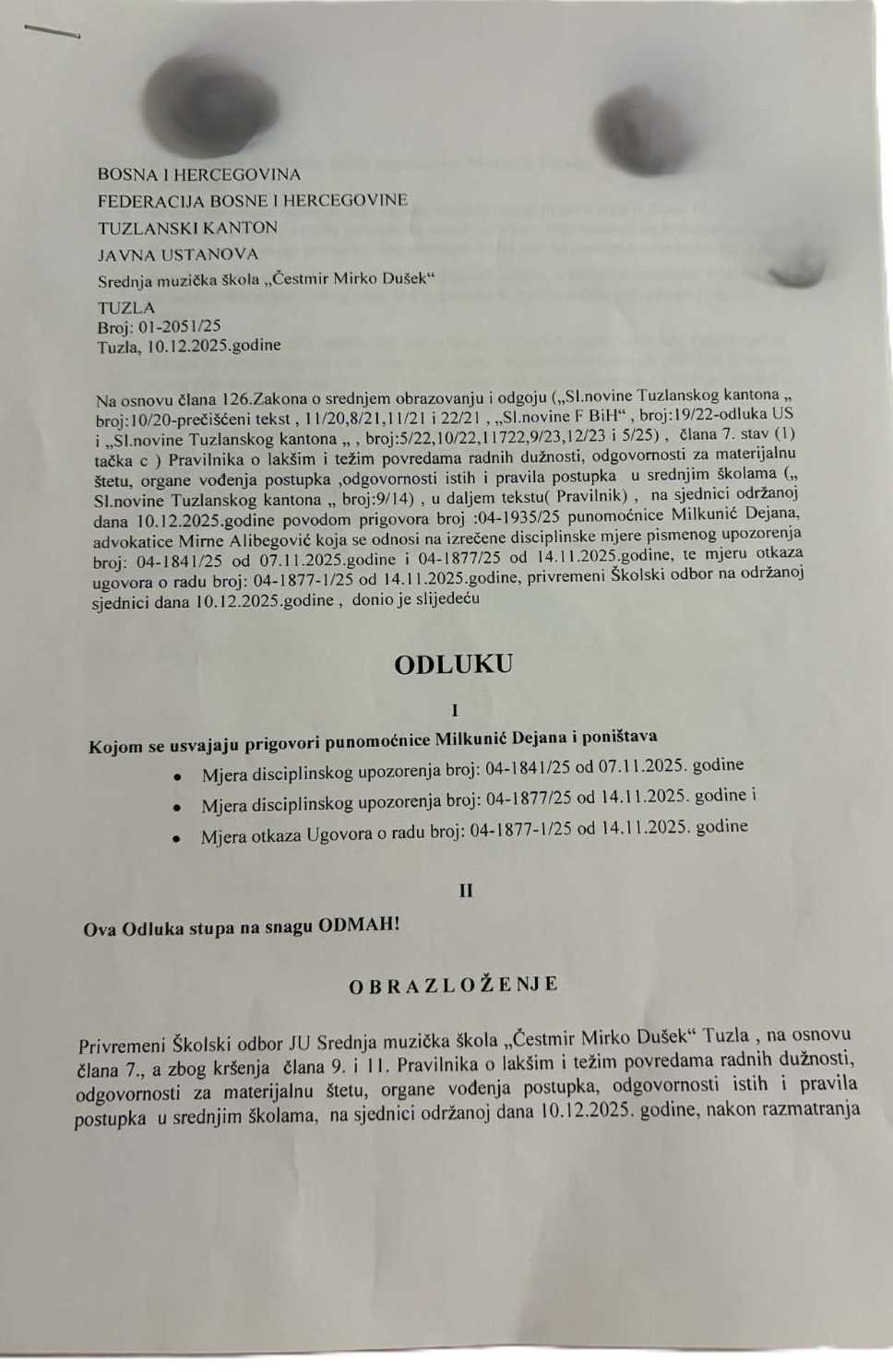 Također, advokatica Alibegović iznosi neistine ili poluistine tvrdeći da su protiv „Milkunića vođeni i disciplinski postupci, koji su okončani bez utvrđivanja bilo kakve odgovornosti, odnosno bez oglašavanja krivim za bilo kakva postupanja suprotna zakonu ili važećim propisima“. Želimo obavijestiti javnost da je Disciplinska komisija Srednje muzičke škole „Čestmir Mirko Dušek“ utvrdila da je optuženi Dejan Milkunić počino teže povrede radne obaveze, a u vezi sa prijavama za seksualno uznemiravanje učenica i za verbalno vrijeđanje učenika škole. Školski odbor navedene ustanove osporio je odluku Disciplinske komisije zbog proceduralnih propusta, a ne zbog nedostatka dokaza. Dakle, djelo teže povrede radne obaveze nedvosmisleno je utvrđeno još pred Disciplinskom komisijom matične ustanove, ali je Milkunić izbjegao sankcije zbog proceduralnih propusta službenika škole, što je sada predmet proširene istrage Tužilaštva BiH.