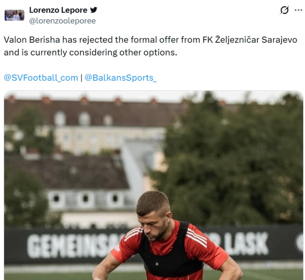 Valon Berisha je odbio formalnu ponudu Fudbalskog kluba Željezničar Sarajevo i trenutno razmatra druge opcije, objavio je fudbalski insajder Lorenzo Lepore.