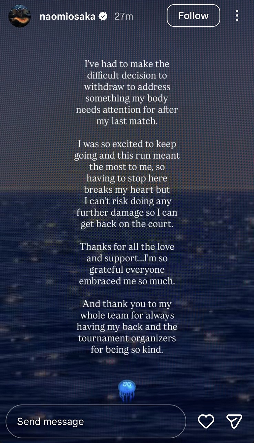 "Morala sam donijeti tešku odluku da se povučem kako bih se posvetila problemu kojem je mom tijelu potrebna pažnja nakon posljednjeg meča. Bila sam jako uzbuđena što mogu nastaviti i ovaj niz mi je značio najviše, zato mi je izuzetno teško stati ovdje. Ipak, ne mogu riskirati dodatnu povredu kako bih se mogla vratiti na teren", napisala je Osaka na Instagramu, pa dodala: