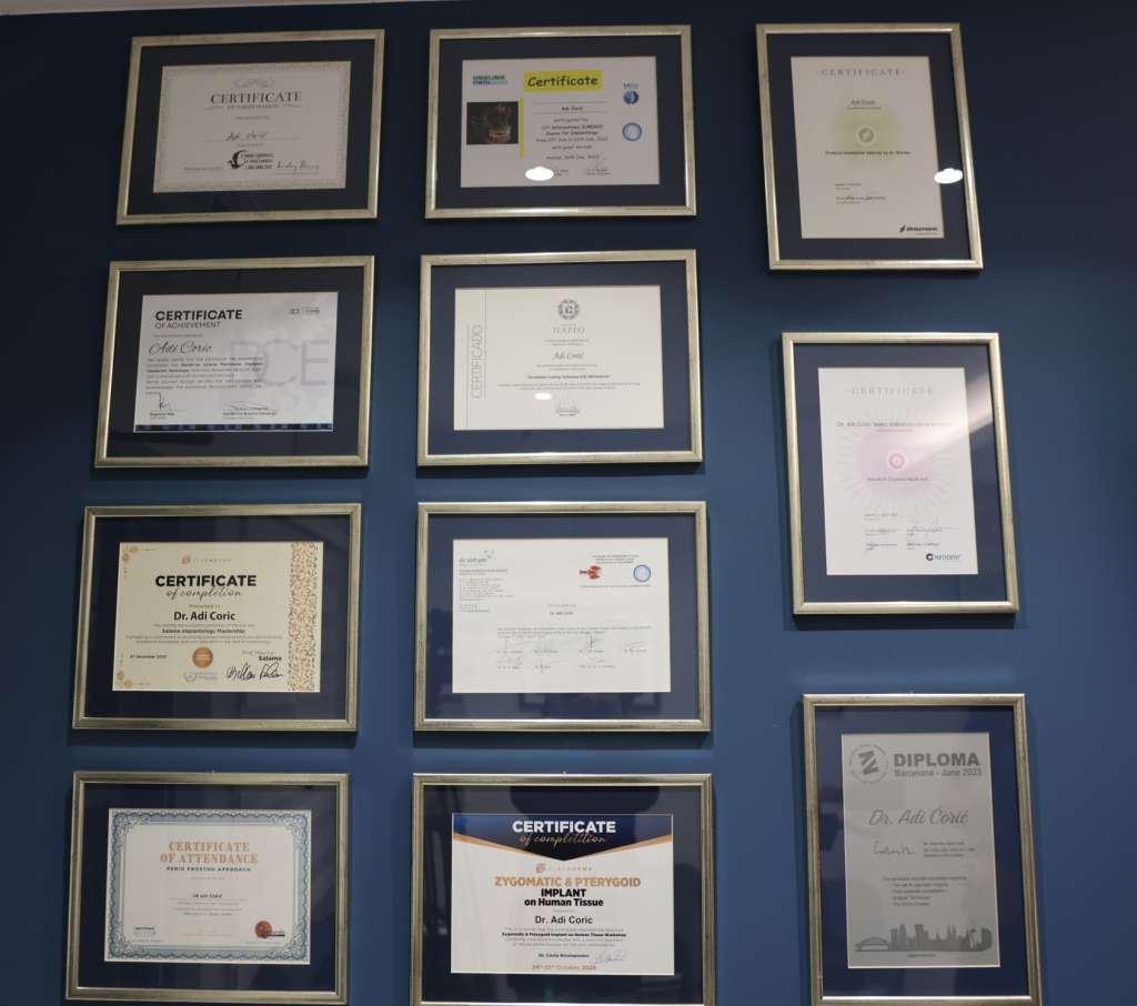 Pored specijalizacije, dodatno su educirani i certificirani u ZAGA centru u Barceloni kod svjetski priznatih pionira zigomatične implantologije, prof. Carlosa Aparicija i prof. Vanderalime, tvorca transnazalne tehnike ugradnje implantata. Također, jedini su u Bosni i Hercegovini koji su prošli dodatnu edukaciju na Univerzitetskom kliničkom centru u Grazu, na Institutu za anatomiju, kod prof. Koste Nikopolousa.