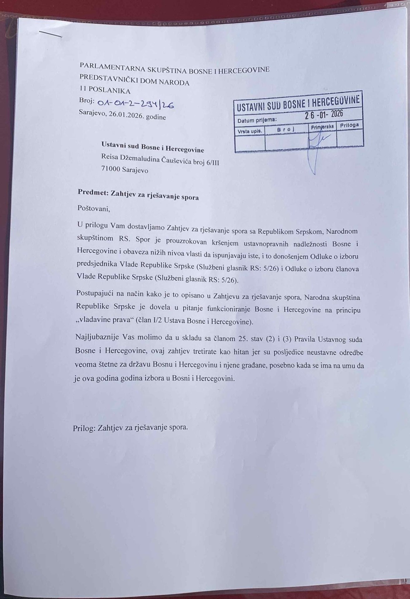 - Najljubaznije Vas molimo da zahtjev tretirate kao hitan jer su posljedice neustavne odredbe veoma štetne za državu Bosne i Hercegovine i njene građane, posebno kada se ima na umu da je ova godina godina izbora u Bosni i Hercegovini - navedeno je u dopisu 11 zastupnika Ustavnom sudu BiH kojeg je objavio zastupnik SDA u Parlamentu BiH Edin Ramić na svom Facebook profilu.