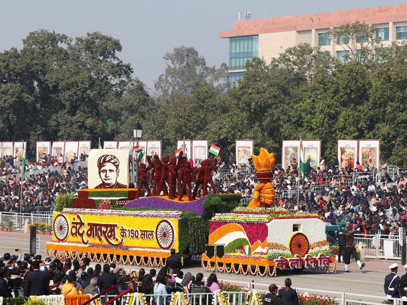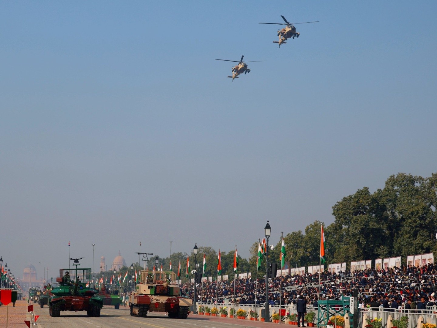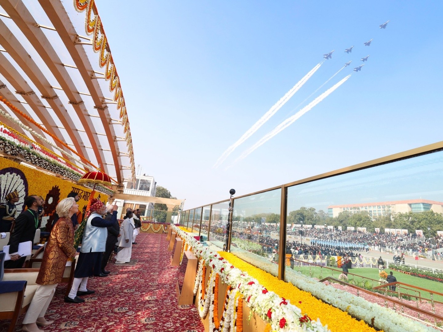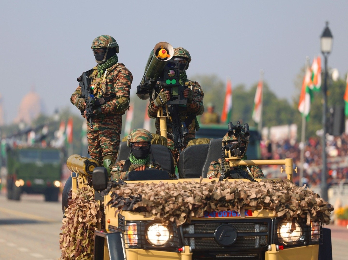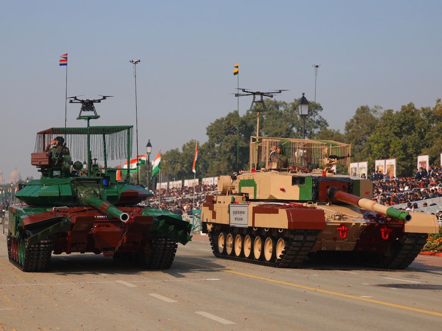 Vojni orkestri i jedinice jahačke i kamilske kavalrije paradirali su kroz glavni grad, dok su borbeni avioni preletali iznad, a najnovija indijska vojna oprema bila je izložena. Spektakl je uključivao i indijske sisteme protivvazdušne odbrane – uključujući rakete i dronove – koji su korišteni u četverodnevnom sukobu s Pakistanom prošle godine.
