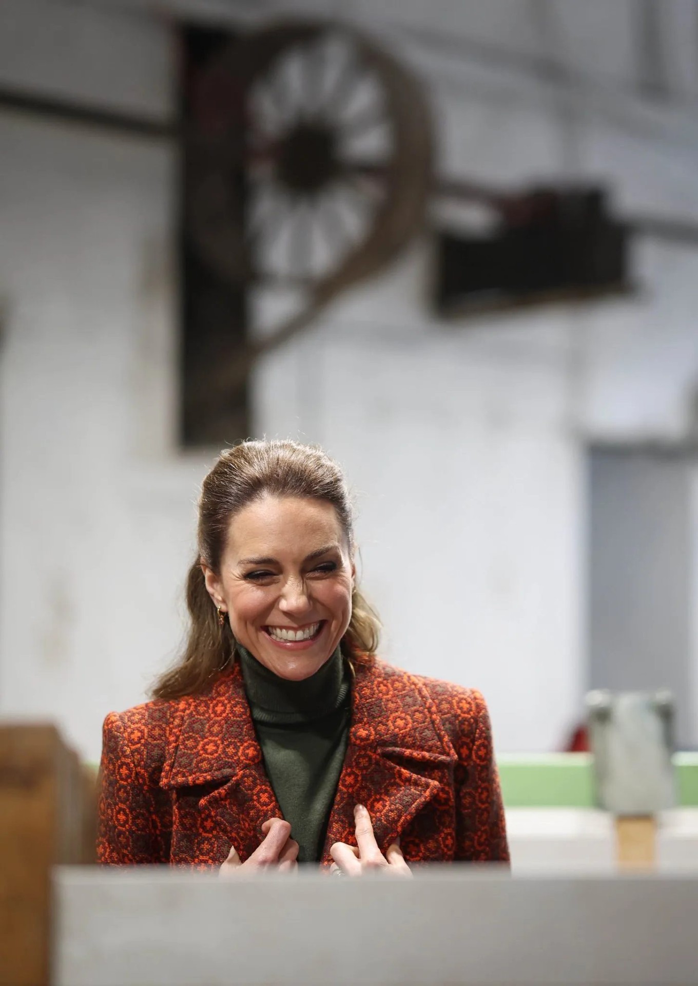 Kao kontrast narančastoj boji kaputa, supruga princa Williama dodala je i kaki hlače širokih nogavica s potpisom Victorije Beckham i odgovarajuću dolčevitu.