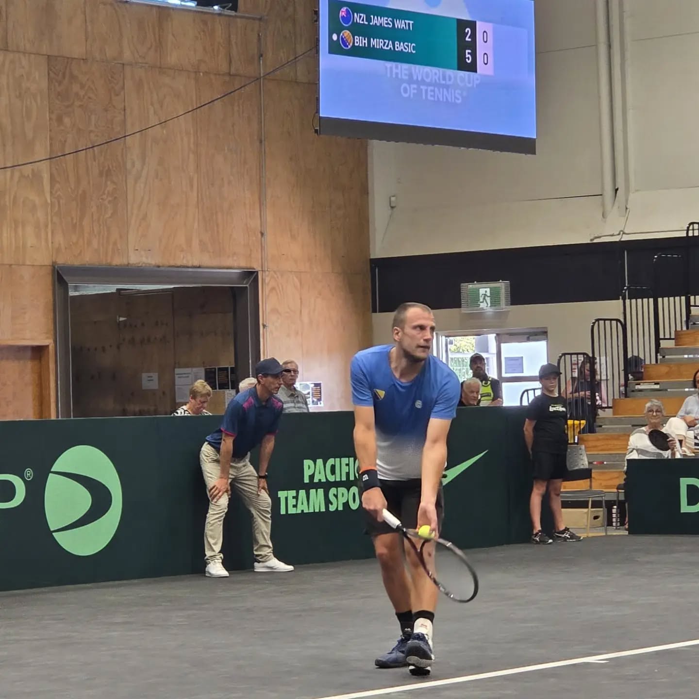 U drugom meču prvog dana susreta Novi Zeland – BiH, Mirza Bašić je ostvario pobjedu nad Jamesom Wattom. U prvom setu Mirza je dva puta oduzeo servis protivniku, te lagano riješio prvi set u svoju korist rezultatom 6:2.