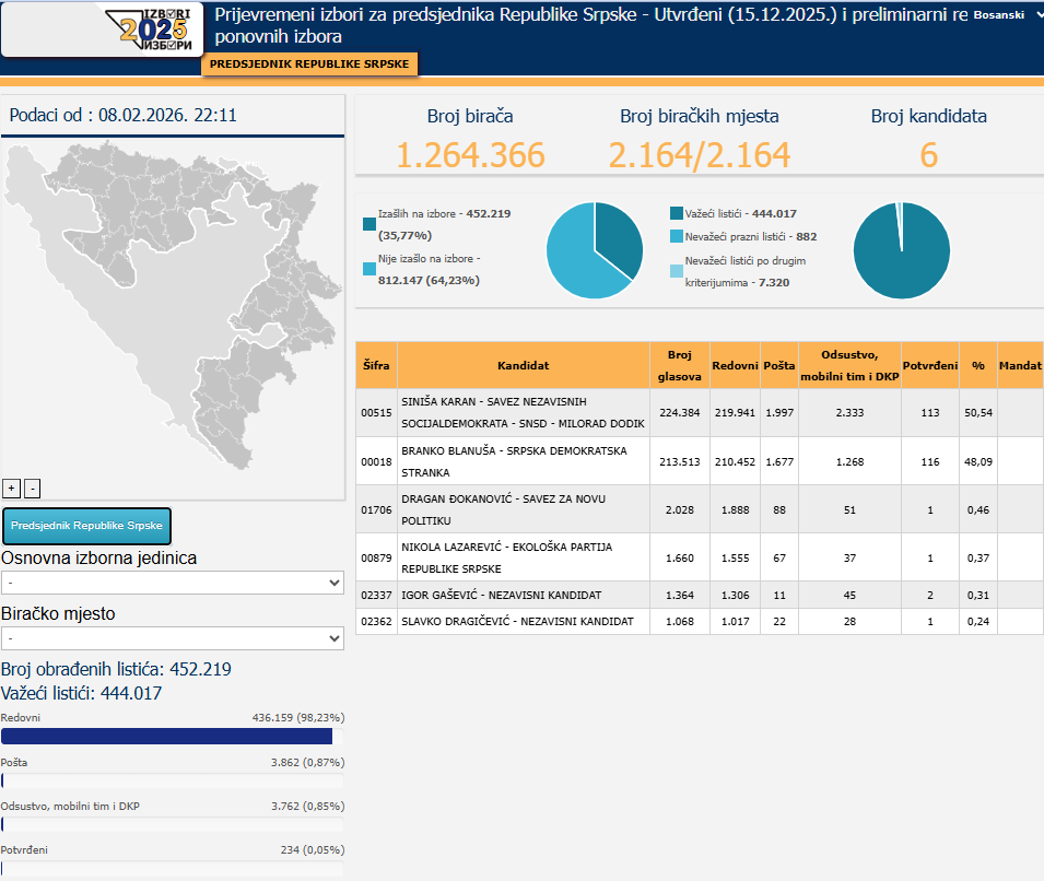 Centralna izborna komisija BiH je na današnjoj sjednici donijela Odluku o utvrđivanju i objavlјivanju rezultata ponovnih prijevremenih izbora za predsjednika Republike Srpske na 136 biračkih mjesta u 17 osnovnih izbornih jedinica.