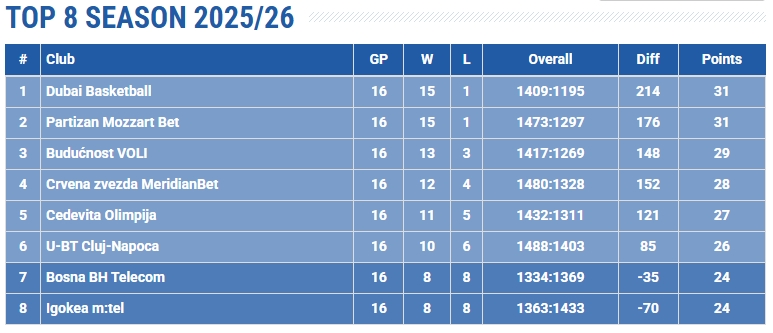 Najbolji klubovi lige nakon prvih 16 kola izborili su plasman u TOP 8, a među njima su dva kluba iz Bosne i Hercegovine: Bosna BH Telecom i Igokea m:tel.