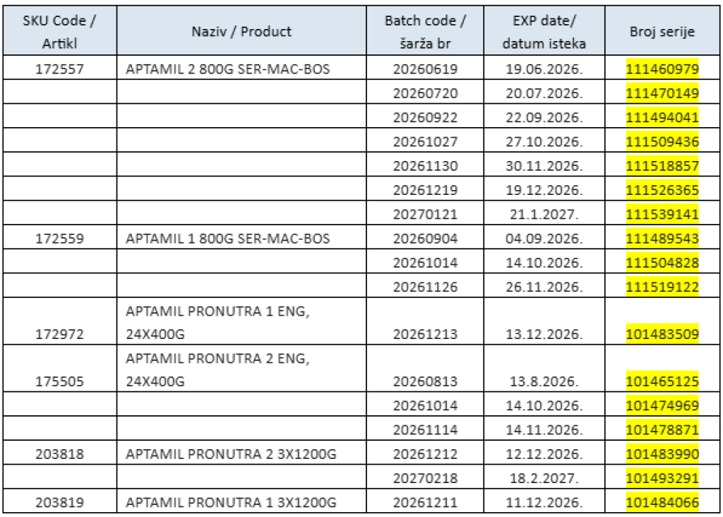 Agencija je zaprimila i obavijest tvrtke Euromand doo, Varaždinska 2, Široki Brijeg, o preventivnom povlačenju određenih serija formula za dojenčad sa tržišta BiH, a na temelju informacija tvrtke Danone, i to: