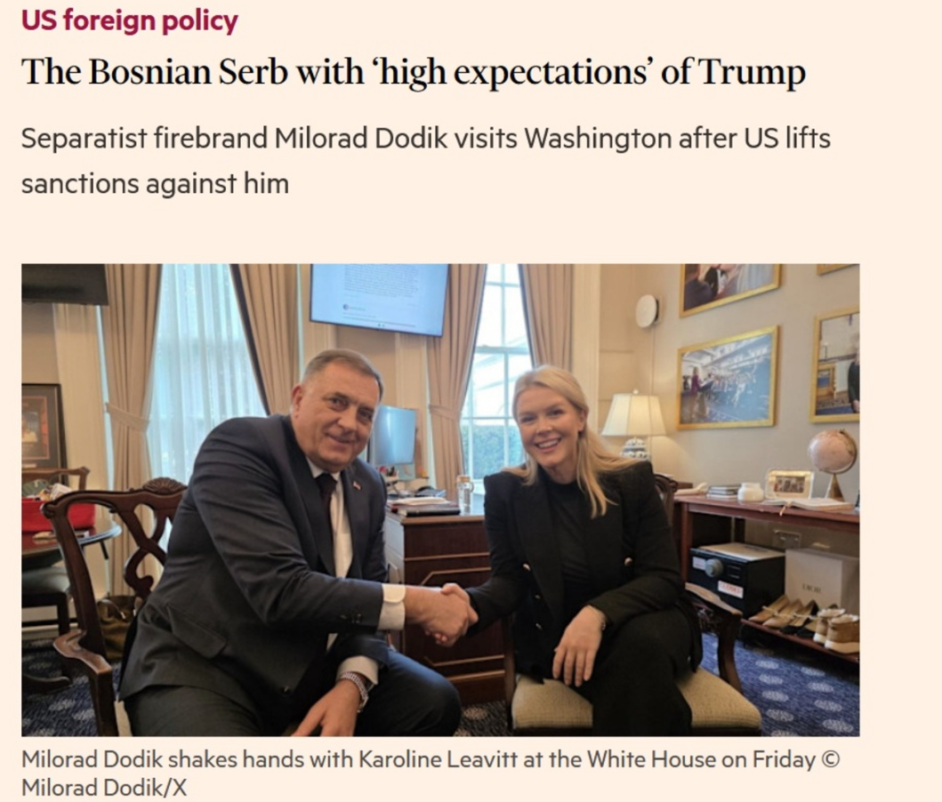Milorad Dodik, bivši lider bosanskih Srba, posjetio je Washington nakon što je američka administracija u oktobru prošle godine ukinula sankcije njemu i desetinama njegovih saveznika i rodbine, prenosi The Financial Times.