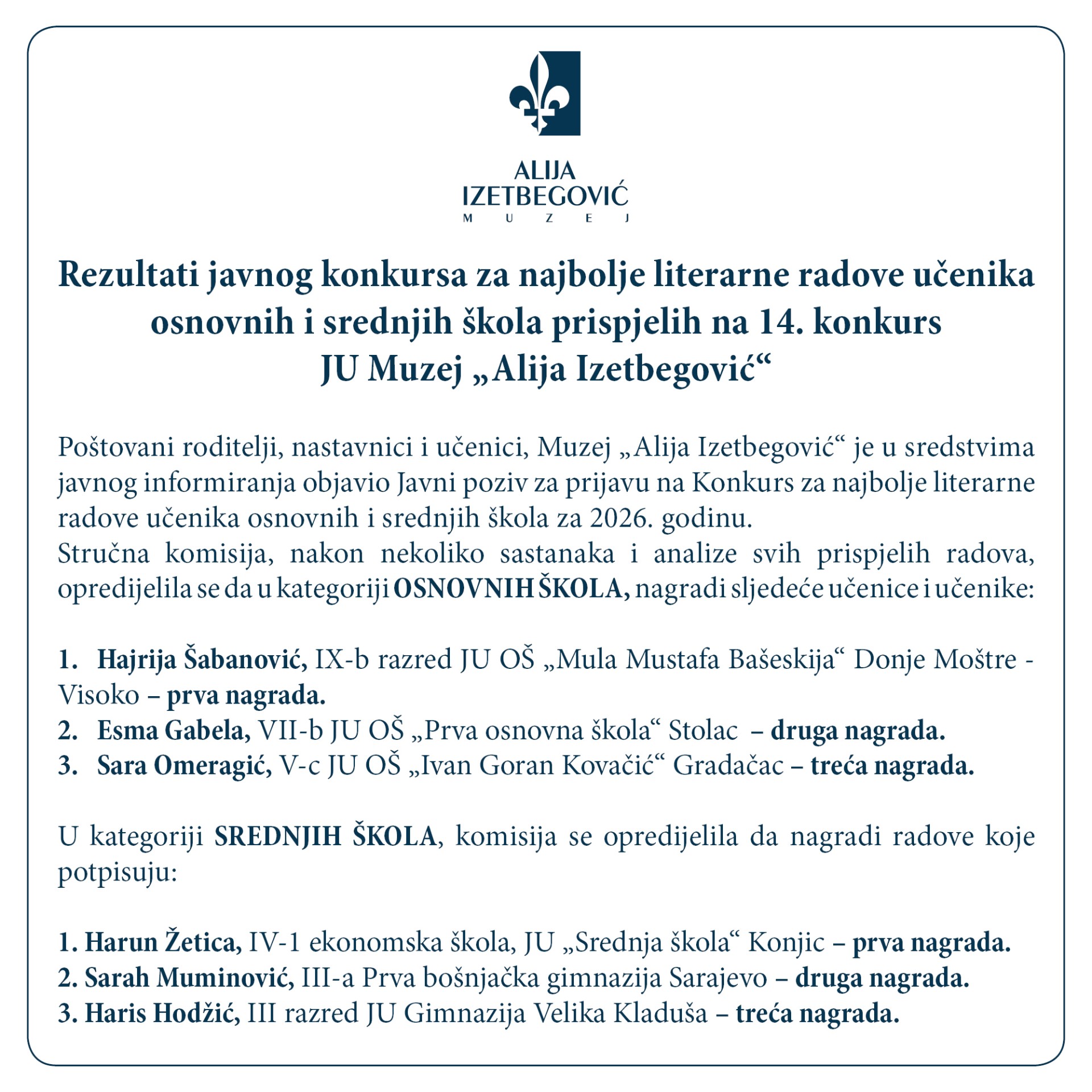 JU Muzej "Alija Izetbegović" objavio dobitnike nagrada za najbolje literarne radove