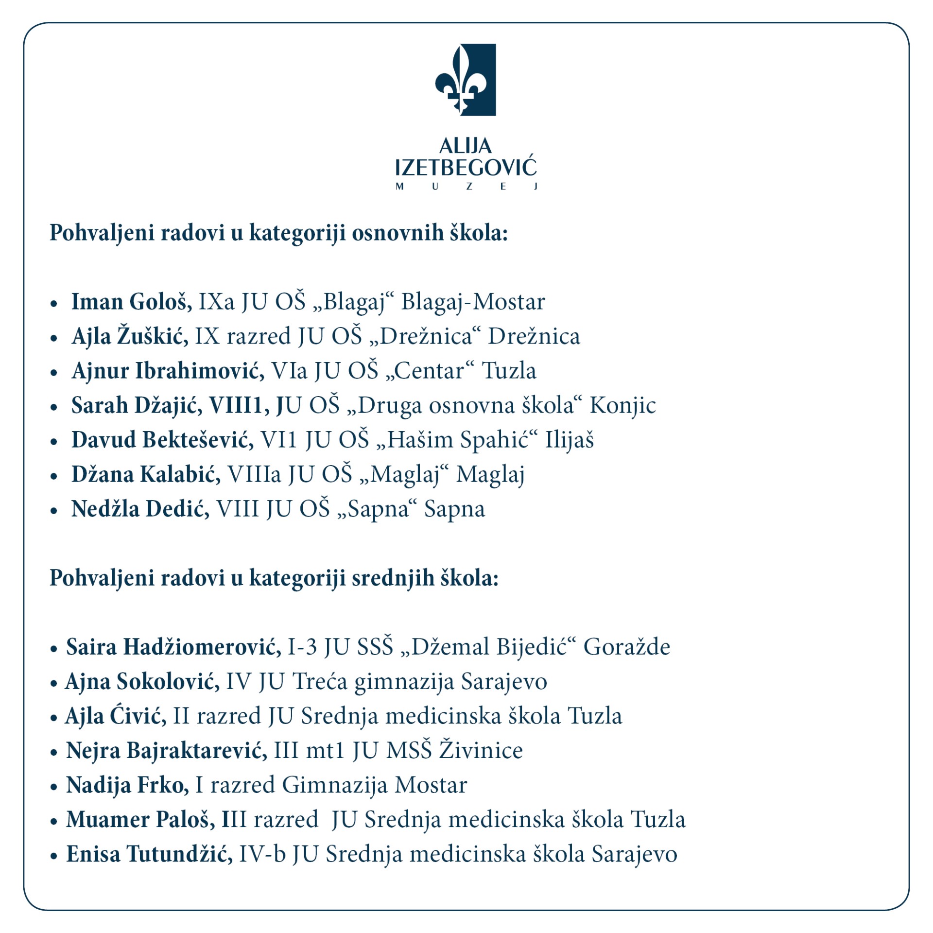 "Posebno nas raduje uključivanje i angažman uprave škola, kao i predanost nastavnika i profesora koji su ohrabrivali učenike na učestvovanje, među kojima su na konkurs pristigli i radovi JU Centar za slušnu i govornu rehabilitaciju Sarajevo i Škola za srednje stručno obrazovanje i radno osposobljavanje Sarajevo, čestitamo.