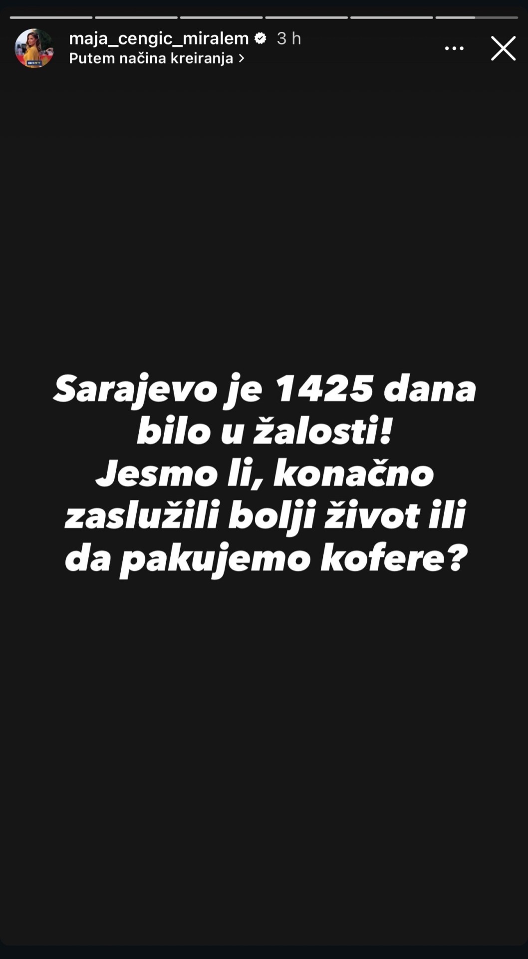 "Sarajevo je 1425 dana bilo u žalosti. Jesmo li, konačno, zaslužili bolji život ili da pakujemo kofere?", objavila je na Instagramu, nakon čega je dodala:
