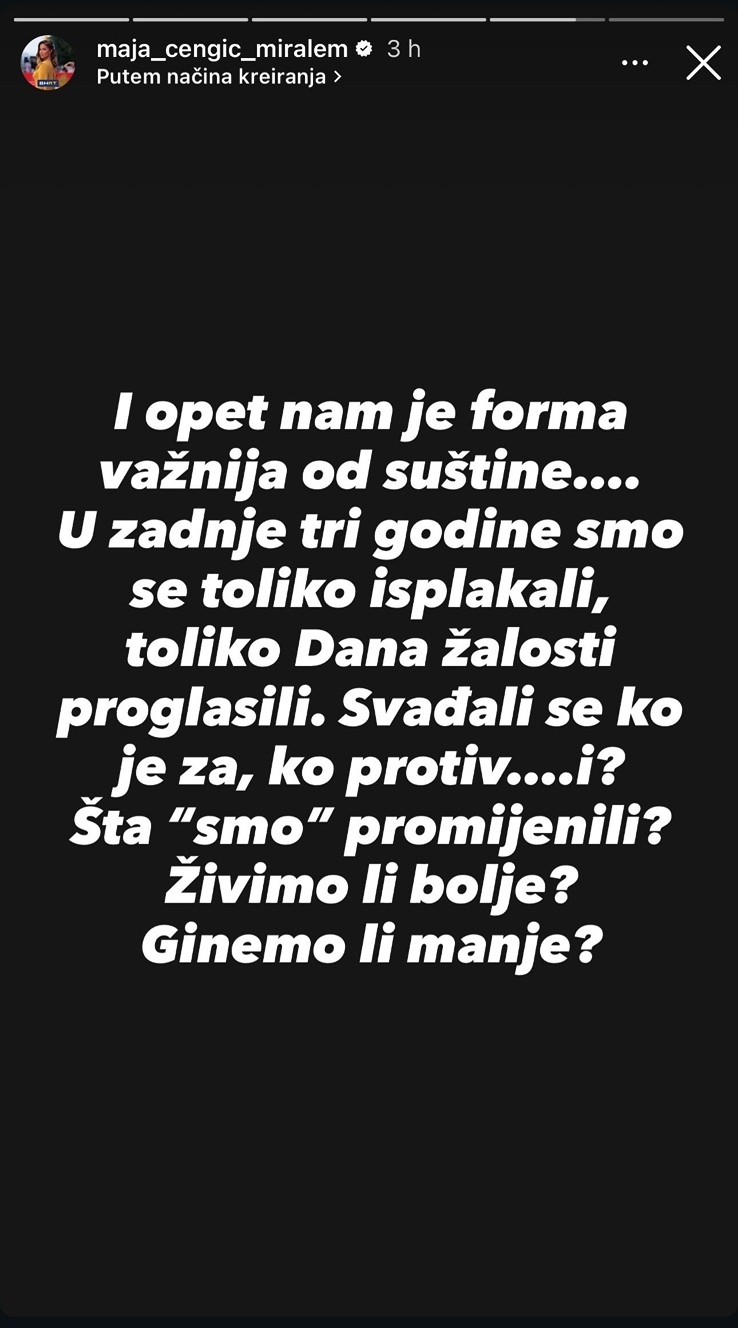 "I opet nam je forma važnija od suštine. U zadnje tri godine smo se toliko isplakali, toliko Dana žalosti proglasili. Svađali se ko je za, ko protiv... I? Šta smo promijenili? Živimo li bolje? Ginemo li manje?".