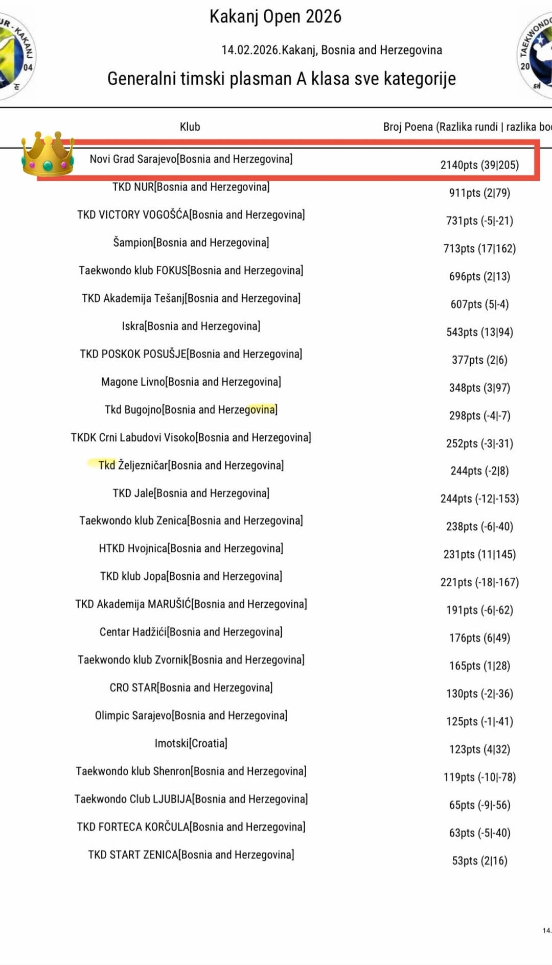 U konkurenciji brojnih klubova iz Bosne i Hercegovine i regiona, takmičari Taekwondo kluba Novi Grad Sarajevo ubjedljivo su osvojili prvo mjesto u ekipnom poretku, potvrdivši kontinuitet vrhunskih rezultata i kvalitetan rad u razvoju mladih sportista.