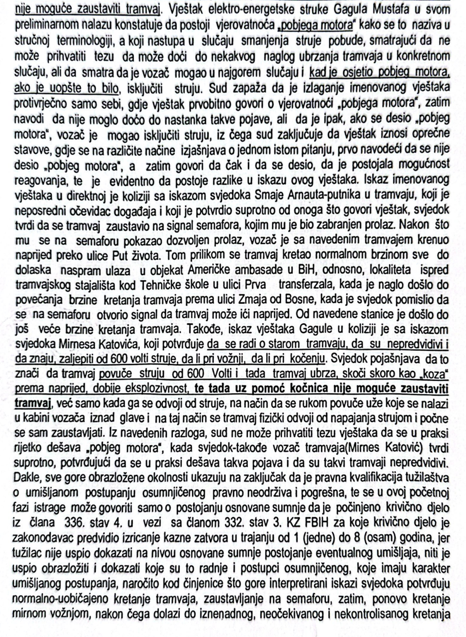 Sud je posebno ukazao na kontradikcije u preliminarnom nalazu vještaka elektroenergetske struke Mustafe Gagule. Vještak je u svom nalazu naveo da postoji vjerovatnoća pojave koja se u stručnoj terminologiji naziva „pobjeg motora“, ali istovremeno je izrazio stav da u konkretnom slučaju "ne može prihvatiti tezu da može doći do nekakvog naglog ubrzanja tramvaja“.