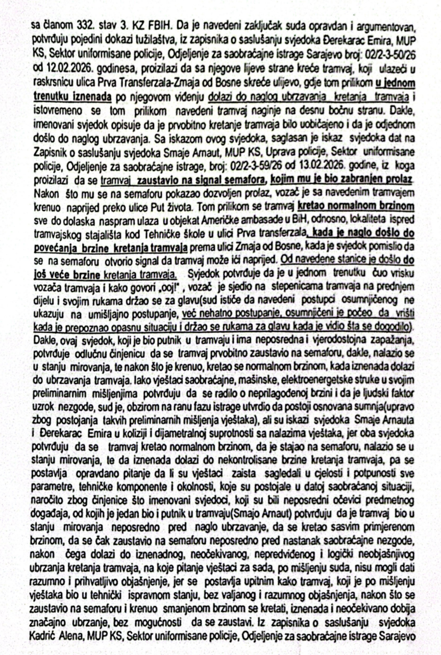 “Sve gore obrazložene okolnosti ukazuju na zaključak da je pravna kvalifikacija tužilaštva o umišljanom postupanju osumnjičenog pravno neodrživa i pogrešna, te se u ovoj početnoj fazi istrage može govoriti samoo postojanju osnovane sumnje da je počinjeno krivično djelo iz člana 336. stav 4, u vezi sa članom 332. stav 3. KZ FBIH za koje krivično djelo je zakonodavac predvidio izricanje kazne zatvora u trajanju od 1 (jedne) do 8 (osam) godina, jer tužilac nije uspio dokazati na nivou osnovane sumnje postojanje eventualnog umišljaja, niti je uspio obrazložiti j dokazati koje su to radnje i postupci osumnjičenog koje imaju karakter umišljanog postupanja, naročito kod činjenice što gore interpretirani iskazi svjedoka potvrđuju normalno-uobičajeno kretanje tramvaja, zaustavljanje na semaforu, zatim, ponovo kretanje mirnom vožnjom, nakon čega dolazi do iznenadnog, neočekivanog i nekontrolisanog kretanja”, navodi se u rješenju Kantonalnog suda.